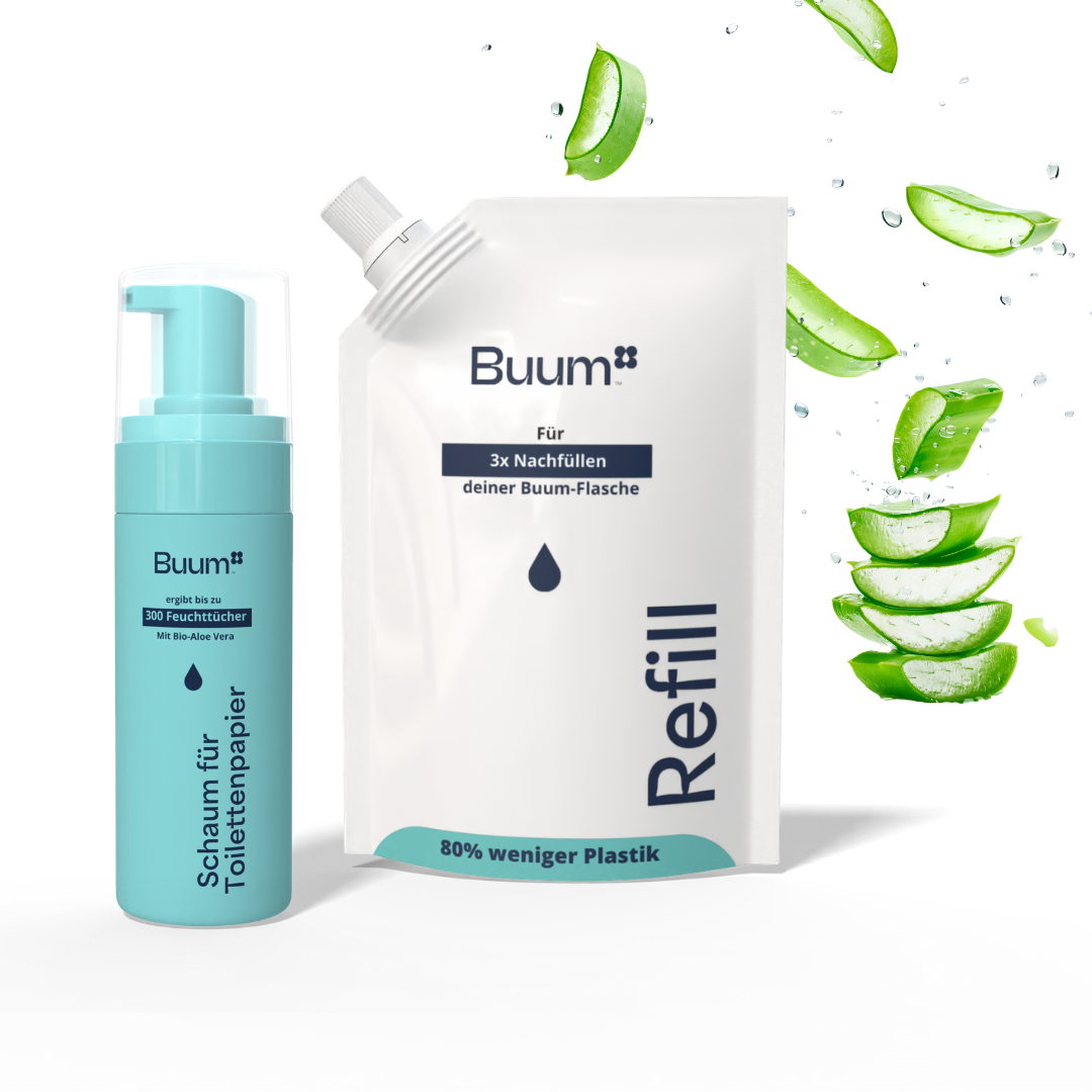 Buum® ist ein sanfter, natürlicher Schaum, der dein Toilettenpapier in ein Feuchttuch verwandelt – Praktisch. Umweltfreundlich. Und extrem ergiebig.