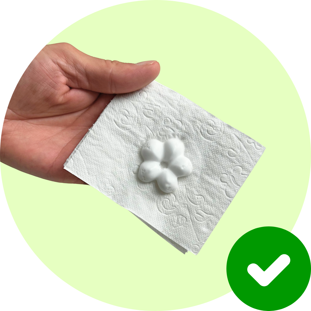 - Einen Pumpstoß Schaum auf zwei bis drei Lagen Toilettenpapier (Je nach Papierqualität) geben