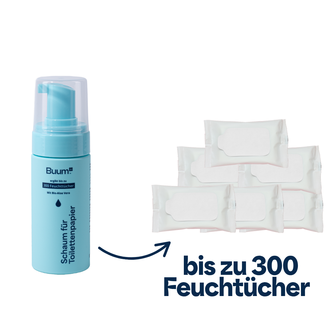 Feuchttücher bestehen oft aus synthetischen Fasern (Plastik) und sind dadurch weder vollständig biologisch abbaubar noch recycelbar. Sie verstopfen Abwassersysteme, belasten Kläranlagen und landen nicht selten in der Natur. Buum hingegen wird einfach auf normales Toilettenpapier aufgetragen – kein zusätzlicher Abfall, keine Entsorgungsprobleme.